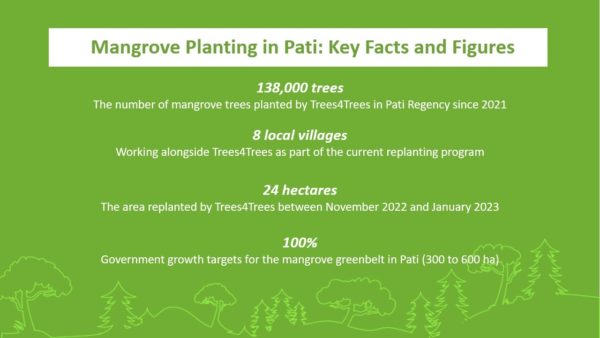 To help bring this green belt to fruition, Trees4Trees began planting mangroves along the Pati coastline from November 2022 to January 2023, as part of the recent planting season. By employing members of the community from eight local villages, Trees4Trees has already planted a total of 108,000 mangrove trees in an area covering 24 hectares.