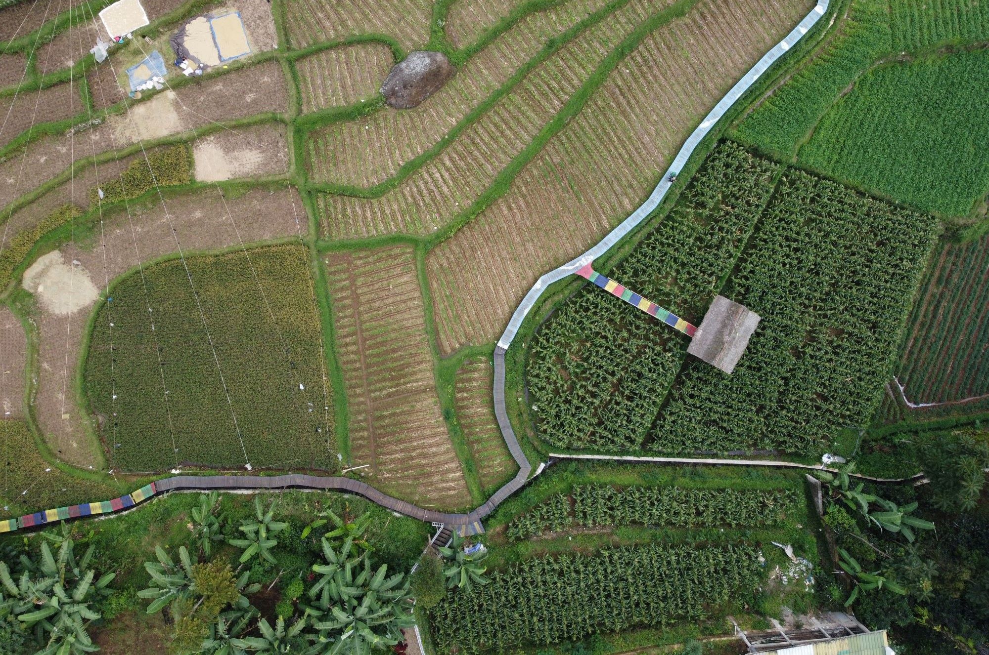 Legok Dayeuh’s main attraction is the vast expanse of rice and corn fields, which cover an area of around five hectares and feature footbridges that allow visitors to immerse themselves in the landscape. Two traditional saung huts, made from bamboo and with roofs of dried sugar palm leaves, provide eye-catching landmarks in the valley.